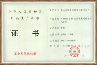 生产的产品均制定有企业标准并经广东省质量技术监督局备案。生产所使用的原药产品均有 相关许可证明文件; 所生产的产品均取得农药登记证和农药生产批准证。